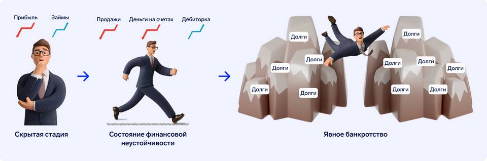 - Неспособность удовлетворить требования кредиторов в течение 3 месяцев